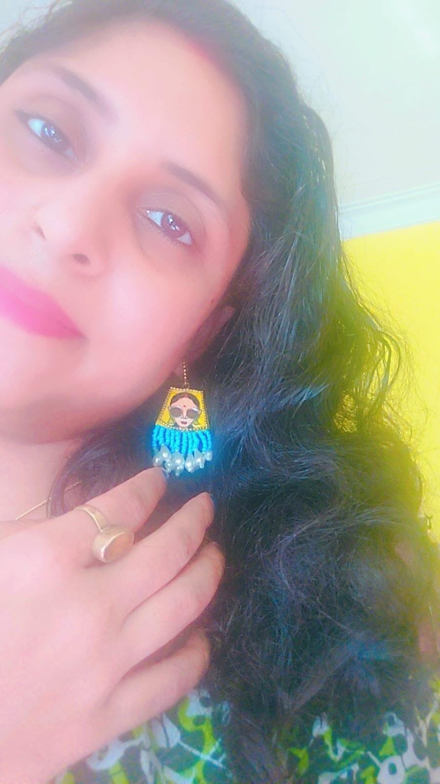 Introducing the Darpan Blue Dazzling handpainted earrings - the perfect accessory for any occasion. These unique and eye-catching earrings feature a traditional woman's face with sun glasses and a bindi in her forehead, expertly handpainted with stunning detail and vibrant colors.