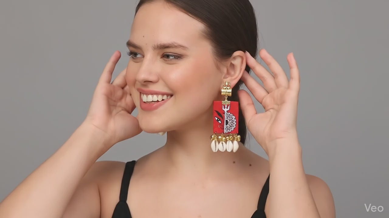 Introducing our stunning Durga Mandala handpainted earrings, the perfect accessory for any occasion. These earrings feature the beautiful face of the Indian goddess Durga Ma, handpainted in a striking combination of red and black colors. The intricate mandala art design is expertly crafted by skilled artisans, adding a unique and eye-catching touch to these earrings. Whether you're dressing up for a special event or simply looking to add a touch of elegance to your everyday look, these earrings are sure to make a statement. With their high-quality craftsmanship and attention to detail, they are sure to be a favorite in your jewelry collection. So why wait? Add some elegance to your wardrobe with our Durga Mandala handpainted earrings today!